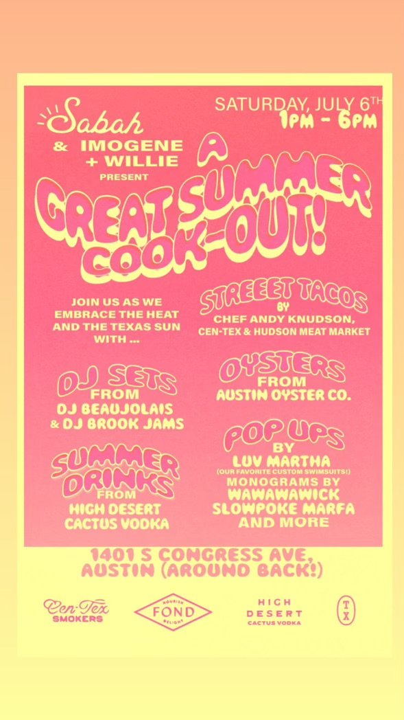 great summer cookout @ Sabah & imogene+willie Saturday, July 6, 2024 1:00 PM 6:00 PM Google Calendar ICS